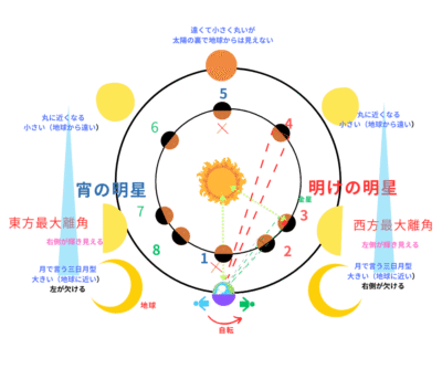 太陽光線が届かなくなった西の位置(昼~夜に向かう青い人の位置)から見えるのは図の左側部分(6,7,8)の宵の明星