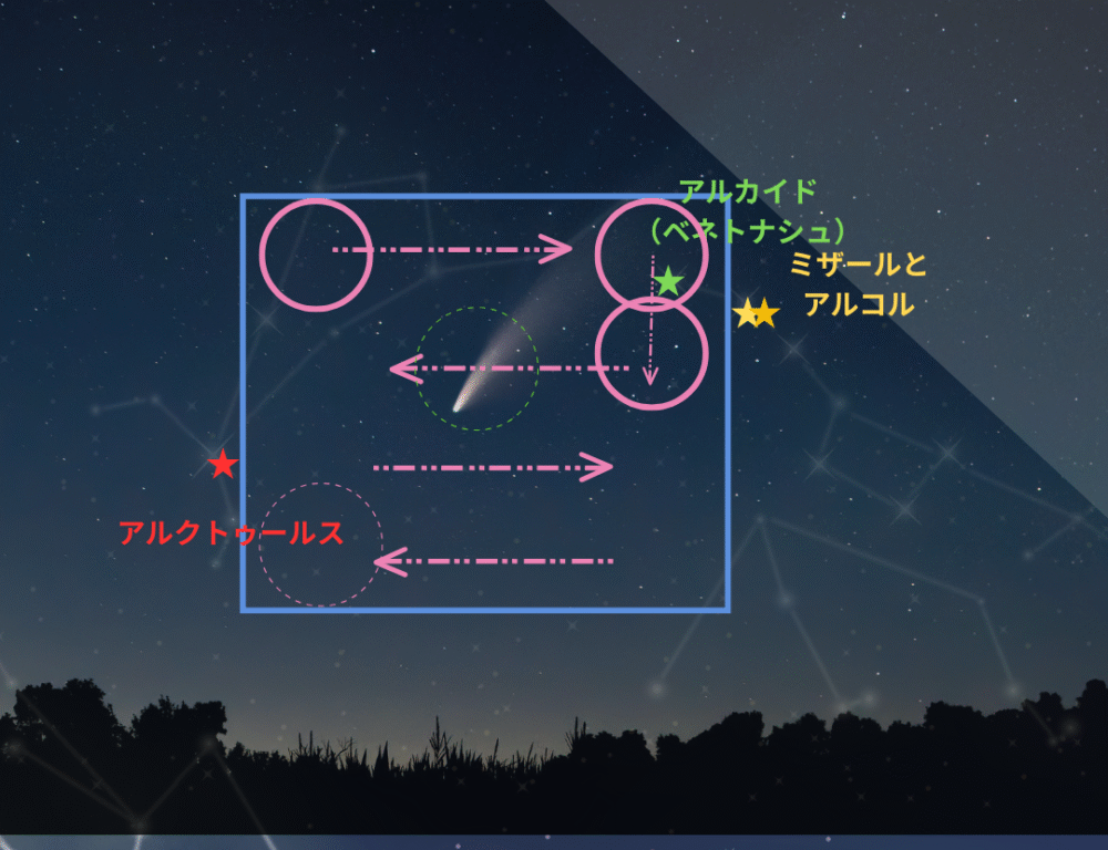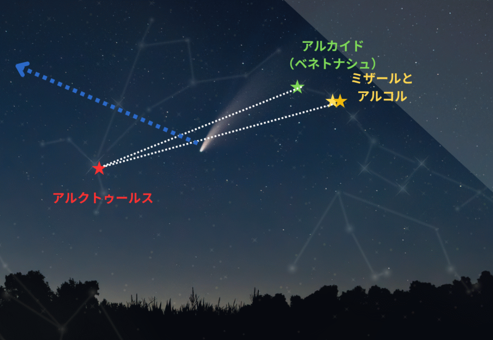 アルクトゥールスの右(北側)に北斗七星が分かれば柄杓(ひしゃく)の柄の一番端(アルカイド)、もしくは2つ目の二重星として有名なミザール(アルコル)とアルクトゥールスのを結んだ真ん中辺りに彗星がいます