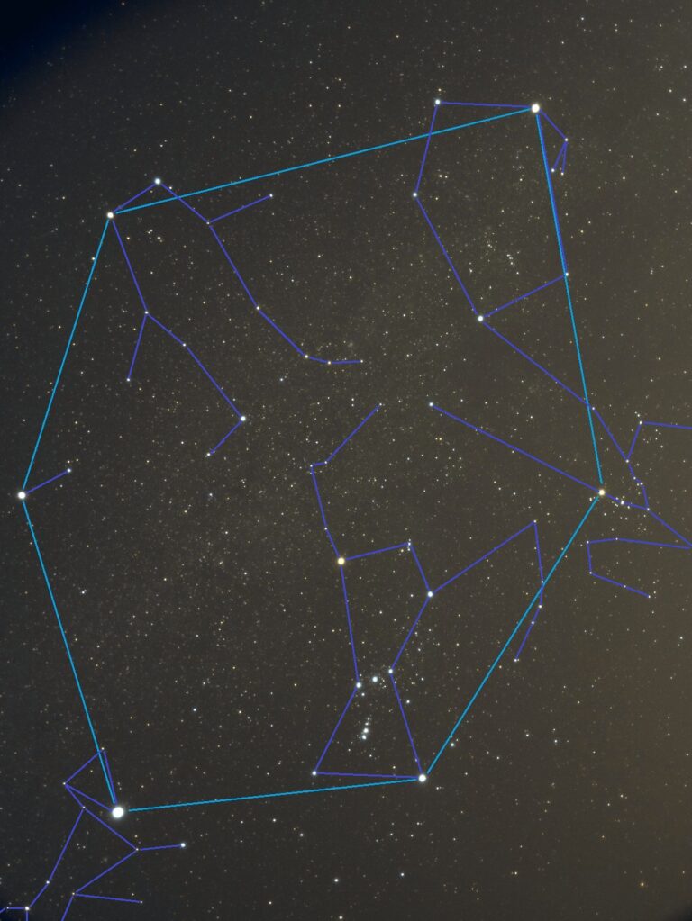 そして2つの星団のある「おうし座」の赤っぽい1等星アルデバラン、このアルデバランのV字のヒヤデス星団を延ばすと角の先にあるのが「ぎょしゃ座」1等星のカペラを含む5角形の星座です